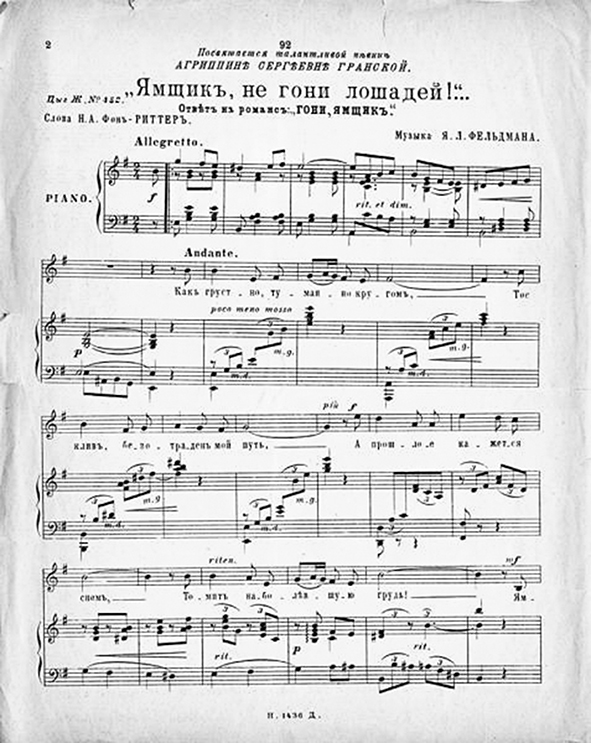 В 1913 году в одном из московских издательств встретились и познакомились два автора: обрусевший немец Николай фон Риттер и начинающий еврейский композитор и музыкант Яков Фельдман. Такова историческая правда об авторах истинно русского романса. Поэт показал свои стихи – Фельдман выбрал некоторые из них, чтобы положить на музыку. „Ямщик, не гони лошадей” особенно приглянулся композитору своей неизбывной печалью и трагедийным звучанием.
