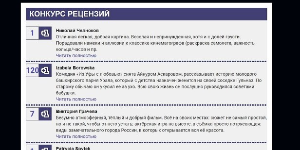 Приз зрительских симпатий в конкурсе рецензий получила Изабела Боровская – студентка Института специализированной и межкультурной коммуникации Варшавского университета – за рецензию, написанную к фильму „Из Уфы с любовью” режиссёра Айнура Аскарова. Она была награждена книгой-альбомом „Россия” Херонима Грали с автографом автора.