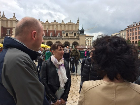 „Краковский рынок, – писал Лесков, – уже был полнёхонек народа. Рынок здешний необыкновенно оригинален. Это не деревенская ярмарка, не губернский базар, не петербургская толкучка. Это огромная площадь, буквально залитая людьми, которые очень покойно продают и очень покойно покупают”. Затем, ведомые описанием товаров, мы прошли вглубь Сукенниц. Конечно, со времен того „первого” путешествия товар сильно изменился, и вместо овощей или мяса продавцы предложили нам краковские сувениры. А мы отправились на улицу Флорианскую, где мысленно закружились в танце, повторяя „па” за писателем. Шарманщик, конечно, уже не тот, что был описан на страницах дневников, но так же, как и в 1863 году, играл „мазура”. Заглянули на Шпитальную, чтобы попробовать краковского пива – по одной кружке – ведь, как и партнёрша по танцу из дневников, мы должны были „днём дело делать”.